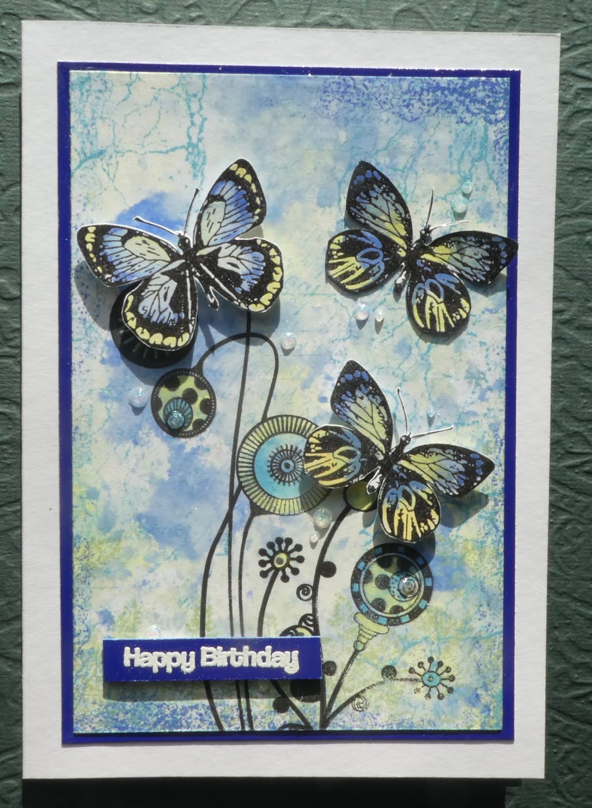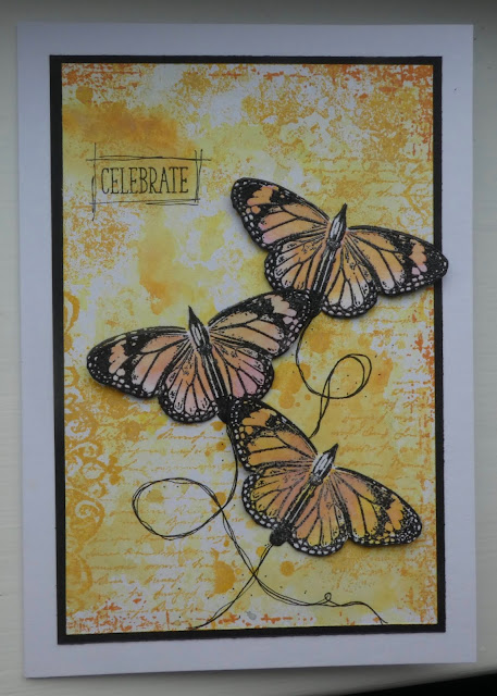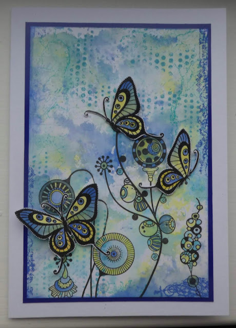 This week was all about butterflies and getting inky. We made our own backgrounds using Distress Oxides and then stamping over them for more texture before adding foliage and butterflies. I made 4 examples and created more backgrounds using up the ink left over on other people's mats. I made some of my best backgrounds that way (serendipity, eh!)
