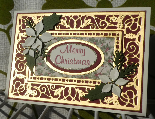 It's an A6, flat for posting card, using a pretty die I used for quite a few of my own Christmas cards. I like how versatile it is, and as it doesn't need much else, it's quite quick to make.