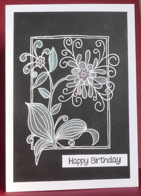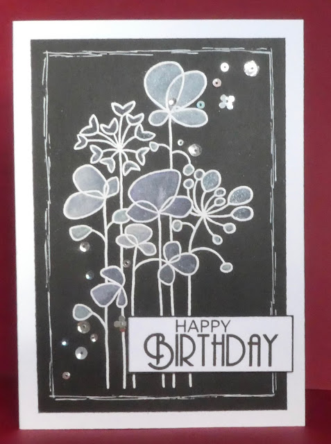 We heat embossed a floral design on black card and then painted the leaves and petals with white gesso, before repainting them with the Glitter Ink. We added more glitter with sequins. I got a bit carried away and did a few samples. It was an easy project so people could do another one if they wanted to. The flowers also looked lovely with just the gesso, so I've left one plain (not shown), as did some of the others.